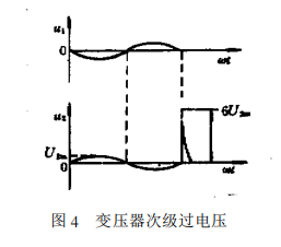 另一方面,直流屏变压器交流侧也会由于大容量负载如大变比变压器的合闸瞬间、其它负载切断电源时以及整流变压器电刀闸的开关断开,也会由于初次级绕组间的分布电容,变压器的激励电流的突变在次级产生瞬时过电压,其尖峰值可达工作电压峰值的6倍以上,如图4所示。