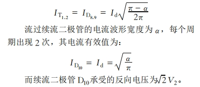 加了续流二极管后其输出电压波形V3与不加续流二极管时相同。原先流经桥臂上元件的续流电流变成经过二极管续流。各原件中流过的电流波形和变压器副边电流波形显着有必定的间隔。每个周期中流过晶闸管T1、T2、D8、D9的电流波形宽度都是π—α,其电流有效值为(Id为负载电流)